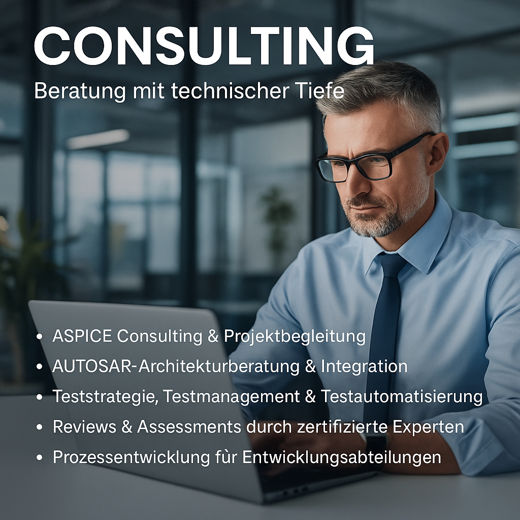 Dabei bringen wir tiefe Erfahrung in Software-, System- und Hardwareentwicklung mit und verbinden diese mit methodischer Beratung nach Automotive SPICE, ISO 26262 und modernen System-Engineering-Ansätzen.